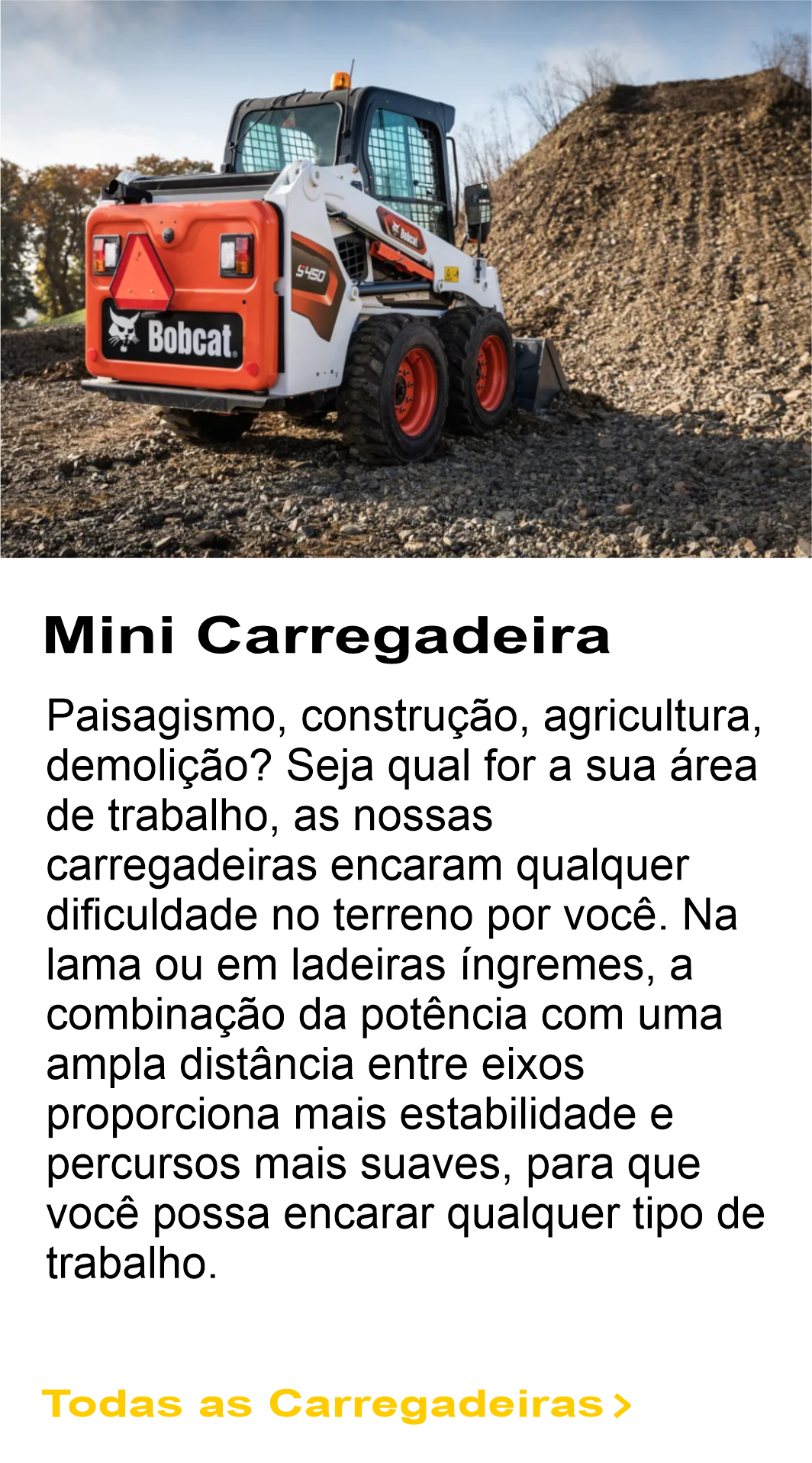 Paisagismo, construção, agricultura, demolição? Seja qual for a sua área de trabalho, as nossas carregadeiras encaram qualquer dificuldade no terreno por você. Na lama ou em ladeiras íngremes, a combinação da potência com uma ampla distância entre eixos proporciona mais estabilidade e percursos mais suaves, para que você possa encarar qualquer tipo de trabalho.